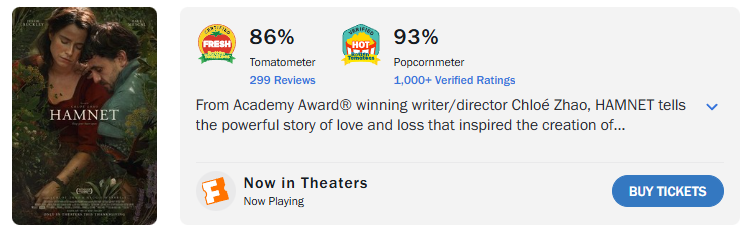 “Hamnet” cuenta con un 86% de aprobación en Rotten Tomatoes por parte de la crítica especializada y un 93% de los aficionados, cifras que reflejan el equilibrio entre reconocimiento experto y aceptación del público. Los analistas destacan la narrativa emotiva, la ambientación histórica y la precisión en los detalles de vestuario y escenografía, que transportan al espectador a la Inglaterra del siglo XVI.