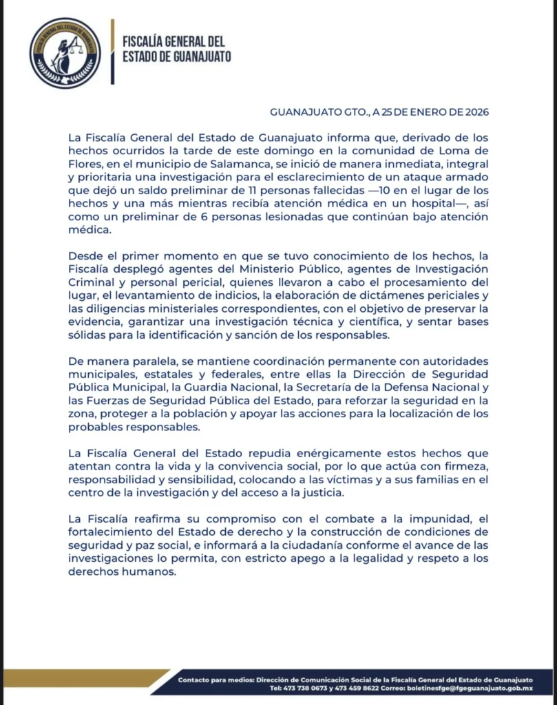 Este domingo 25 de enero se registró un ataque armado en un campo de futbol de la comunidad Loma de Flores, en Salamanca, Guanajuato, que dejó un saldo de 11 personas fallecidas y varias más heridas. El suceso fue confirmado por autoridades municipales, así como por la Fiscalía General del Estado de Guanajuato (FGE).